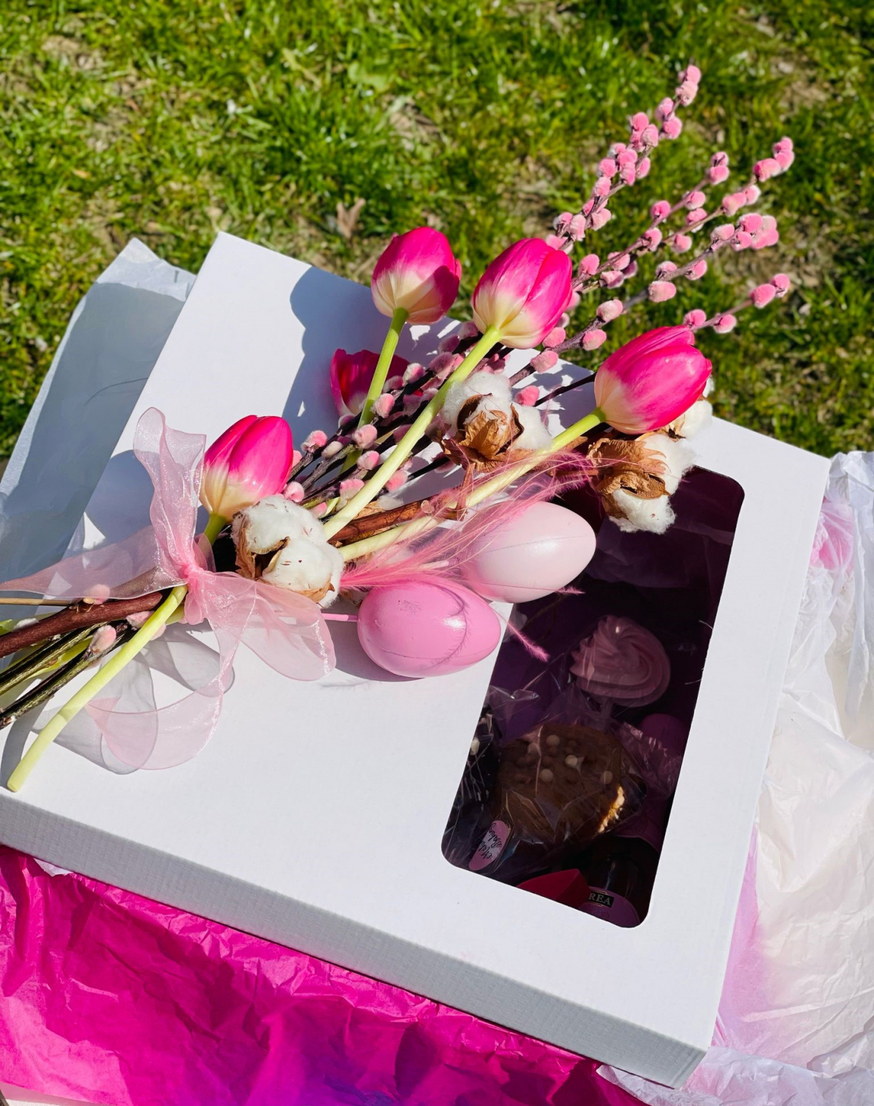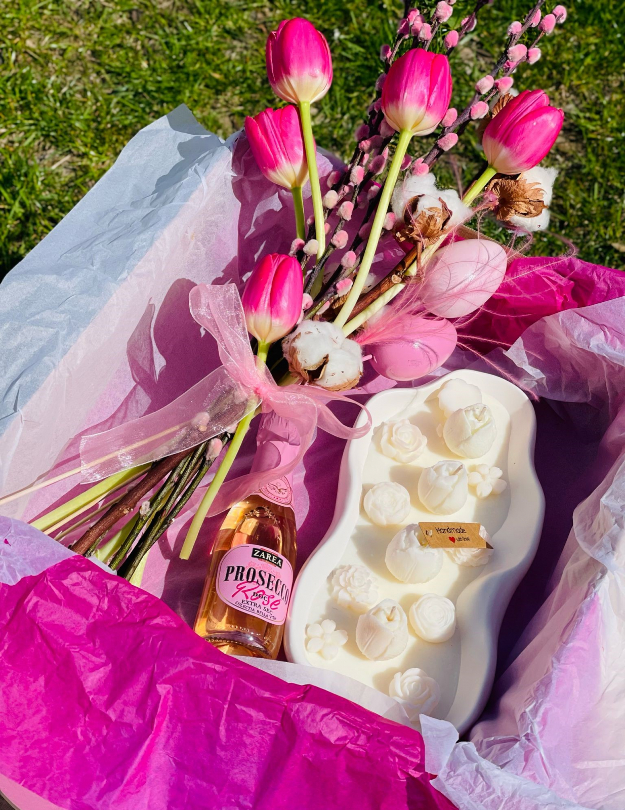 Cutia Happy Easter - O cutie surpriza, buchet cu flori, prosecco mini si lumanare din ceara naturala- Selectia de flori si accesorii se va face in functie de disponibilitate, iar floristul nostru va interpreta aşa cum simte mai bine acest aranjament.