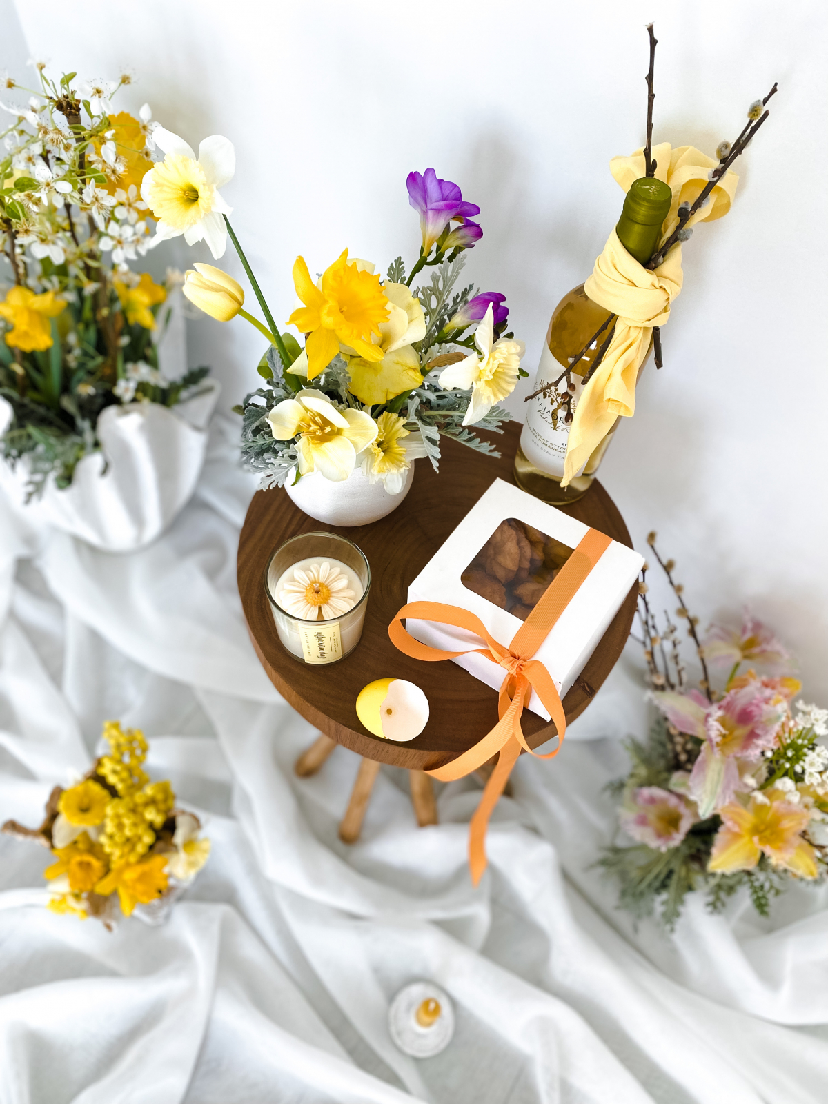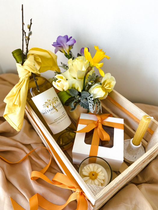 Ladita Happy Easter- O ladita surpriza, aranjament cu flori, ceva dulce, o sticla de vin si lumanare din ceara naturala in suport,  - Selectia de flori si accesorii se va face in functie de disponibilitate, iar floristul nostru va interpreta aşa cum simte mai bine acest aranjament.