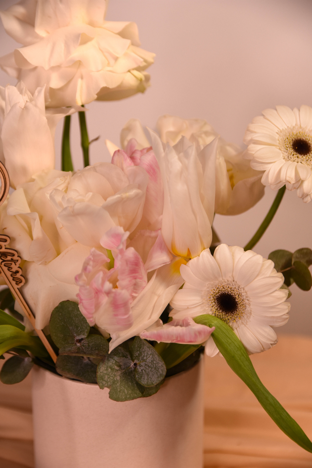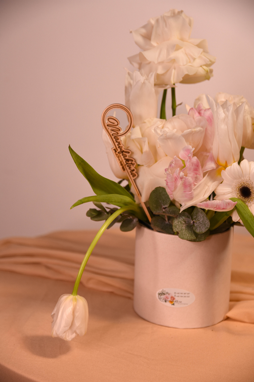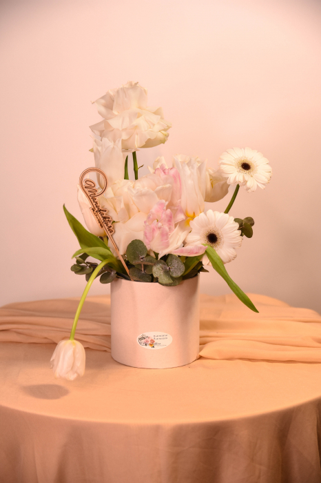 Simplicity for Mary - Cand vrei sa te exprimi simplu poti alege cu sigurata un astfel de aranjament, e dragut si elegant prin culori si texturi.Contine flori de primavara deschise la culoare si nu numai. Selectia de flori si accesorii se va face in functie de disponibilitate, iar floristul nostru va interpreta aşa cum simte mai bine acest aranjament.