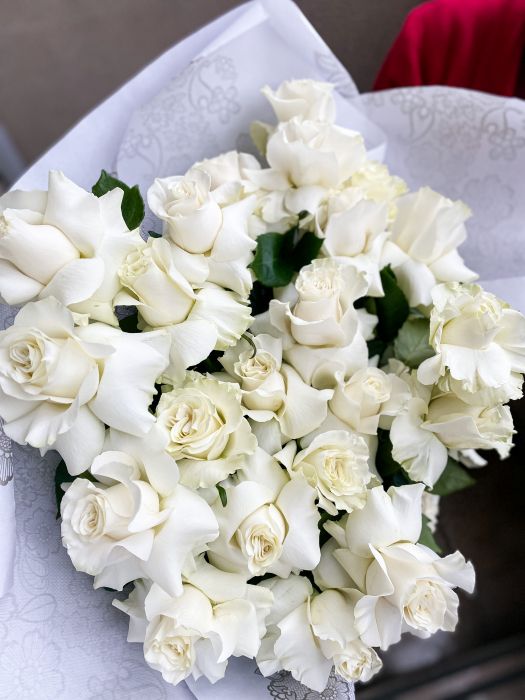 Buchet Pure Love surpinde prin simplitate şi aduce sentimente sincere – Compus din trandafiri albi - selectia de flori si accesorii se va face in functie de disponibilitate, iar floristul nostru va interpreta aşa cum simte mai bine acest buchet.